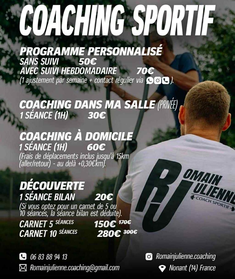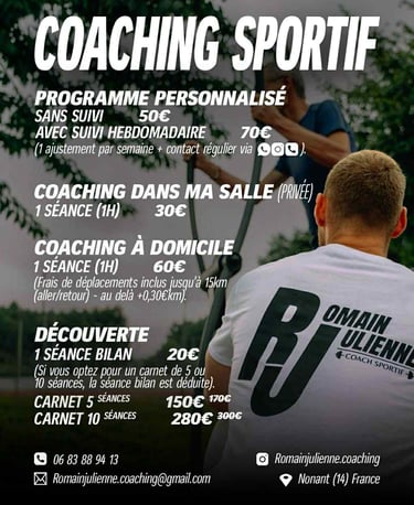 Découvrez mes prestations de coaching sportif adaptées à vos besoins et objectifs personnels.